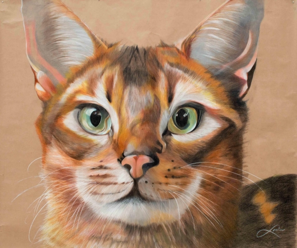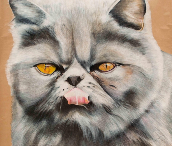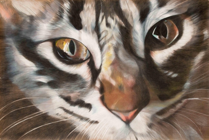 José Luis Loría, un brujo del dibujo científico nos trae la obra ¨La Cofradía de los Ojos ¨, consistente en cientos de dibujos sobre el felino, el “Felix Silvestris”. El uso de lápices de color es único en su estilo y obra, en el sentido que generalmente se utilizan carboncillos negros y/o acuarelas. Las técnicas para lograr los diferentes tonos representan, por sí mismas, un tour de force muy difícilmente igualable. En efecto, Loría utiliza unos 140 lápices de colores distintos, de los cuales cada uno puede rendir 4 ó 5 tonos distintos, el artista habrá extendido su paleta a un abanico de unas 650-700 tonalidades, salvaguardando transparencia y evitando efectos opacos o cargados. Si por fuera poco, hay que subrayar también que la técnica del lápiz no tolera ningún error, ya que es simplemente imposible corregir, menos aún borrar, un tono ¨incorrecto¨.
